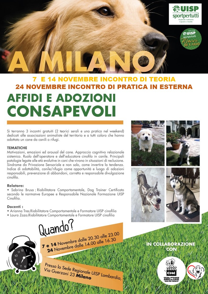 La Struttura di Attività Cinofile UISP Regione Lombardia, organizza il 7-14-24 Novembre 2018, presso la sede Regionale di Via Guerzoni, 23 – Milano, il primo seminario formativo su AFFIDI E ADOZIONI CONSAPEVOLI.