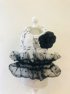 • il Camelia Coco Dress, elegante abitino con gonnellino plissettato e spalline rococò a incrocio elasticizzate e la Camelia Coco Harness, morbida pettorina a corpetto con vistosa balza arricciata in tulle a pois e gancio argento per il guinzaglio; entrambi interamente foderati in gabardine di cotone e chiusi con bottoni a pressione a contrasto smaltati neri, sono corredati dall’immancabile spilla con camelia;