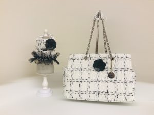 • la Camelia Coco Bag, iconica borsa trasportino del marchio, foderata in viscosa a contrasto, con manici a catena (rigorosamente nickel free) argento e patellina di protezione per la spalla; all’interno, una comoda tasca per gli effetti personali, il gancio di sicurezza ed un cuscinetto estraibile e lavabile per il massimo confort del nostro cucciolo, all’esterno la spilla con camelia in ecopelle nera;